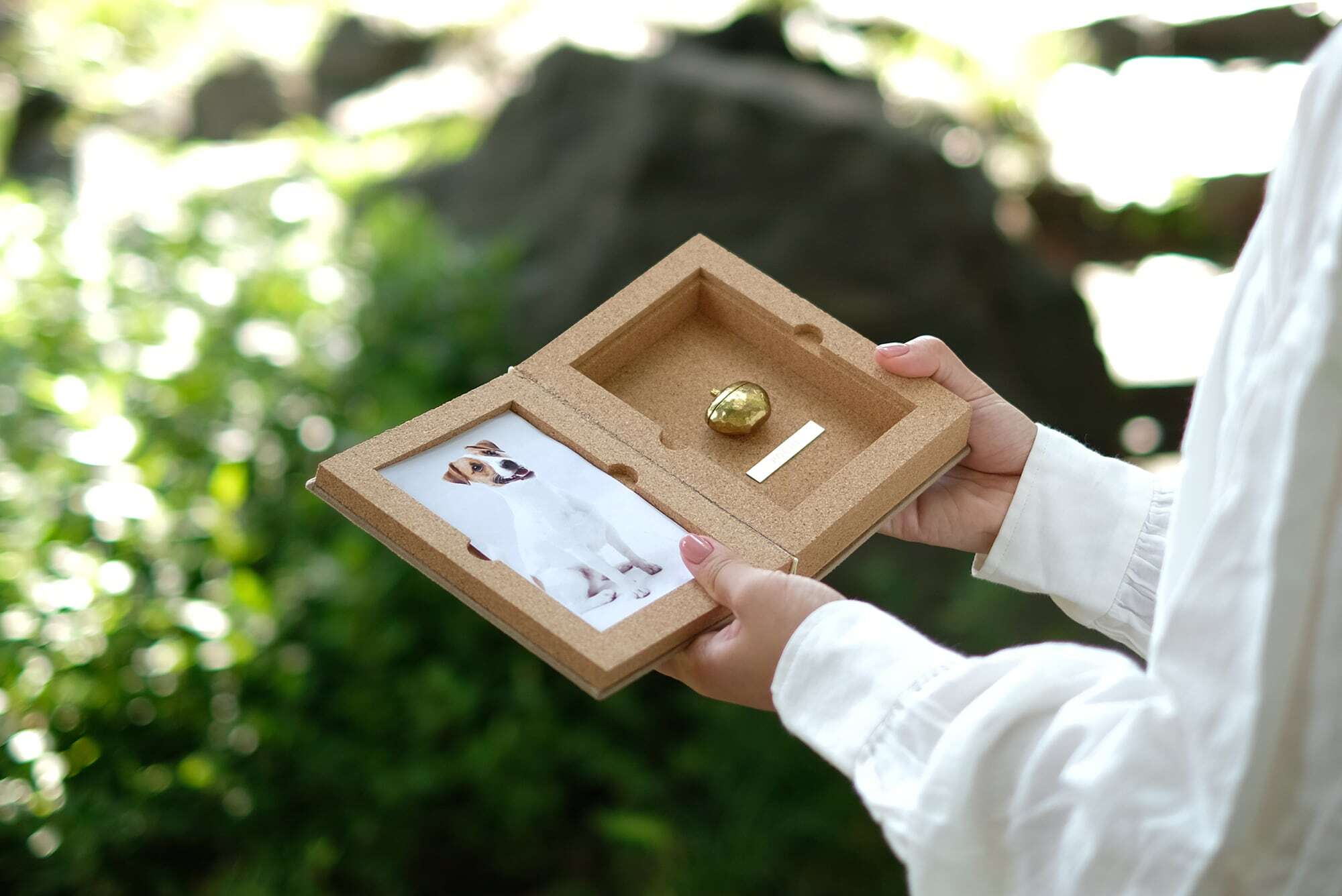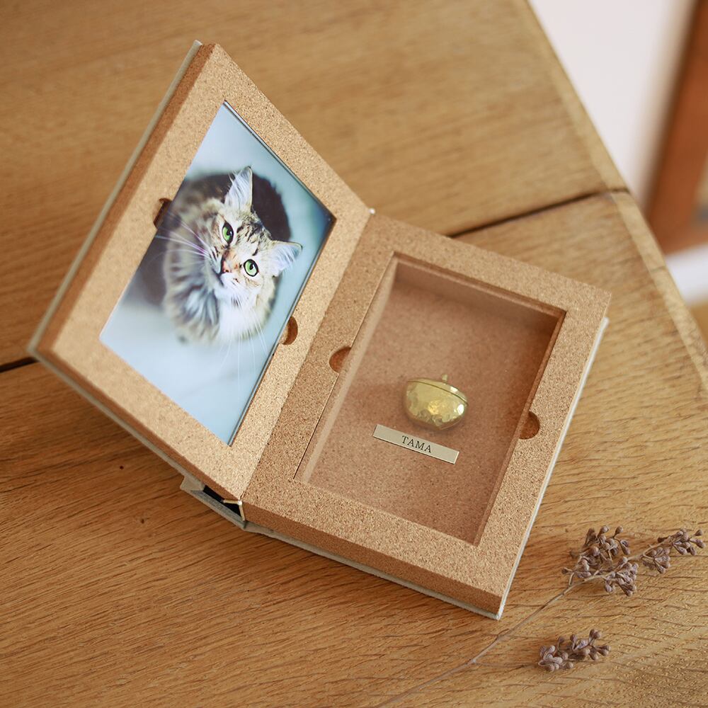 BOOKはペットのご遺骨の一部とお写真を納めることができる"本の形"のお骨壺です。本体はやさしい手触りのフェイクスエードとコルクでとても軽く、サイズもコンパクトでご自宅の好きな場所に飾っていただけます。